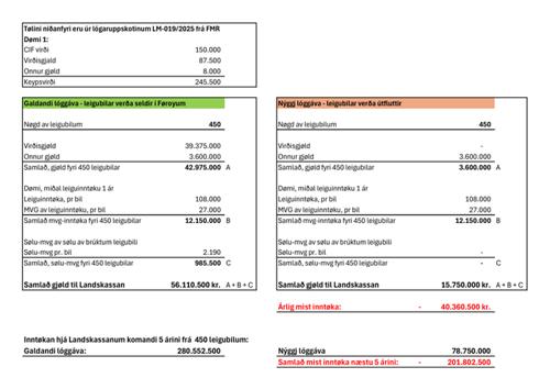 Limirnir, í tí sum nú er Bilasølufelagið, ávaraðu ímóti báðum teimum omanfyri nevndu lógarbroytingunum. Men hvørki Fíggjarmálaráðið ella Løgtingið lurtaðu. Nú ávarar Bilasølufelagið aftur ímóti, at uppskotið um at broyta MVG-reglurnar fyri brúktar leigubilar (LM-019/2025) byggir á skeivar og villleiðandi metingar frá Fíggjarmálaráðnum. Hóast ráðið sigur, at uppskotið fer at geva landskassanum eina meirinntøku, vísa almenn hagtøl og royndir frá vinnuni, at veruleikin er beint øvugtur.