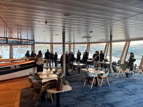Umborð á Norrönu tók Svein í Heiðunum, Service and Quality Manager, ímóti og greiddi frá umbyggingini og hentleikunum, sum eru umborð. Síðani varð bjóðað til brellbitar, meðan Henny á Líknargøtu, Director Travel, greiddi frá virkseminum hjá Smyril Line og søgu felagsins.