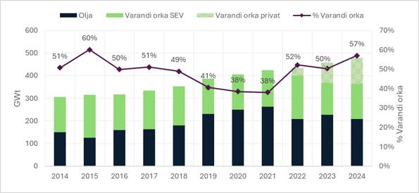 Í 2024 vóru 271 GWt av varandi elorku, og av teimum áttu privatar fyritøkur 115 GWt. Uttan privat initiativ var varandi parturin munandi lægri.